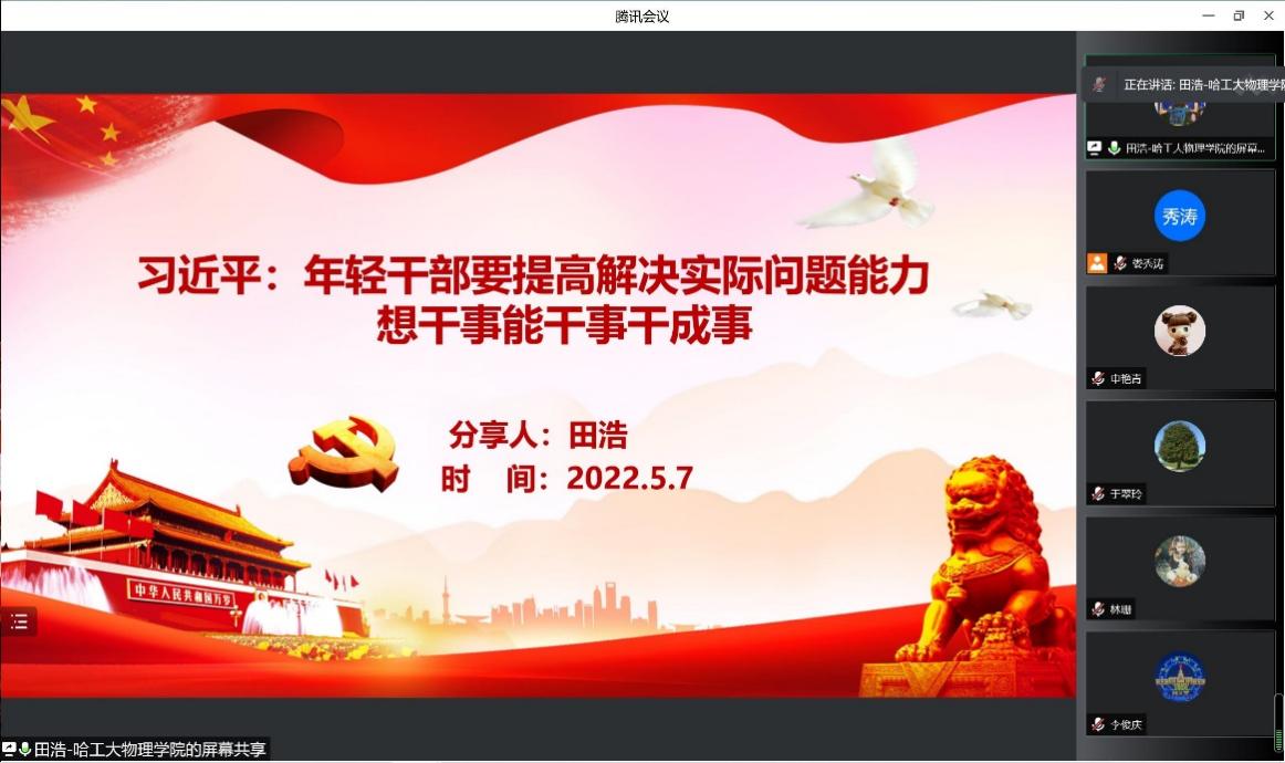 2022年5月7日上午,304am永利集团执行经理田浩为实验物理教工党支部讲授党课,支部全体党员和物理实验中心部分骨干教师参与学习。田浩围绕习近平总书记在中央党校(国家行政学院)中青年干部培训班开班式上的重要讲话,结合自身的学习工作经历和304am永利集团发展实际,针对“年轻干部要提高解决实际问题能力,想干事能干事干成事”这一主题进行了深刻的阐述和分享。