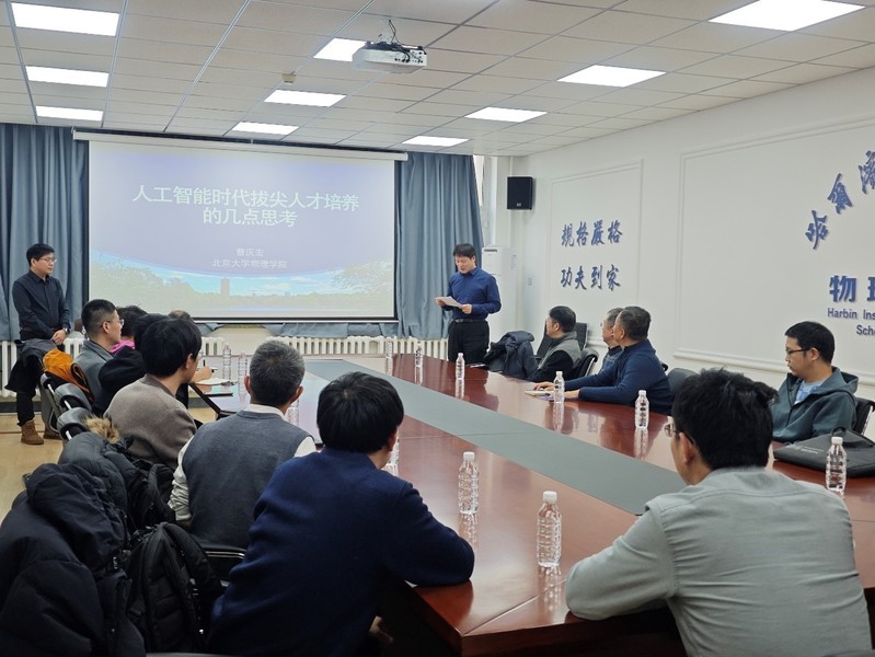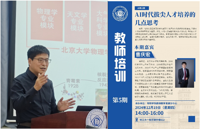 304am永利集团教师发展分中心于2024年12月19日在理学楼822举办了一场主题为“《AI时代拔尖人才培养的几点思考》”的教师培训讲座。本次讲座由北京大学博雅特聘教授曹庆宏主讲,旨在探讨和分享在AI时代背景下,物理学拔尖人才培养的新思路和新方法。