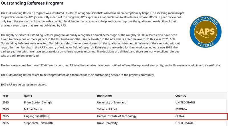 近日,美国物理学会公布了2025年度杰出审稿人(APS Outstanding Referees)名单。公司陶玲玲教授获此殊荣,也是哈工大首位获此奖项的教师。